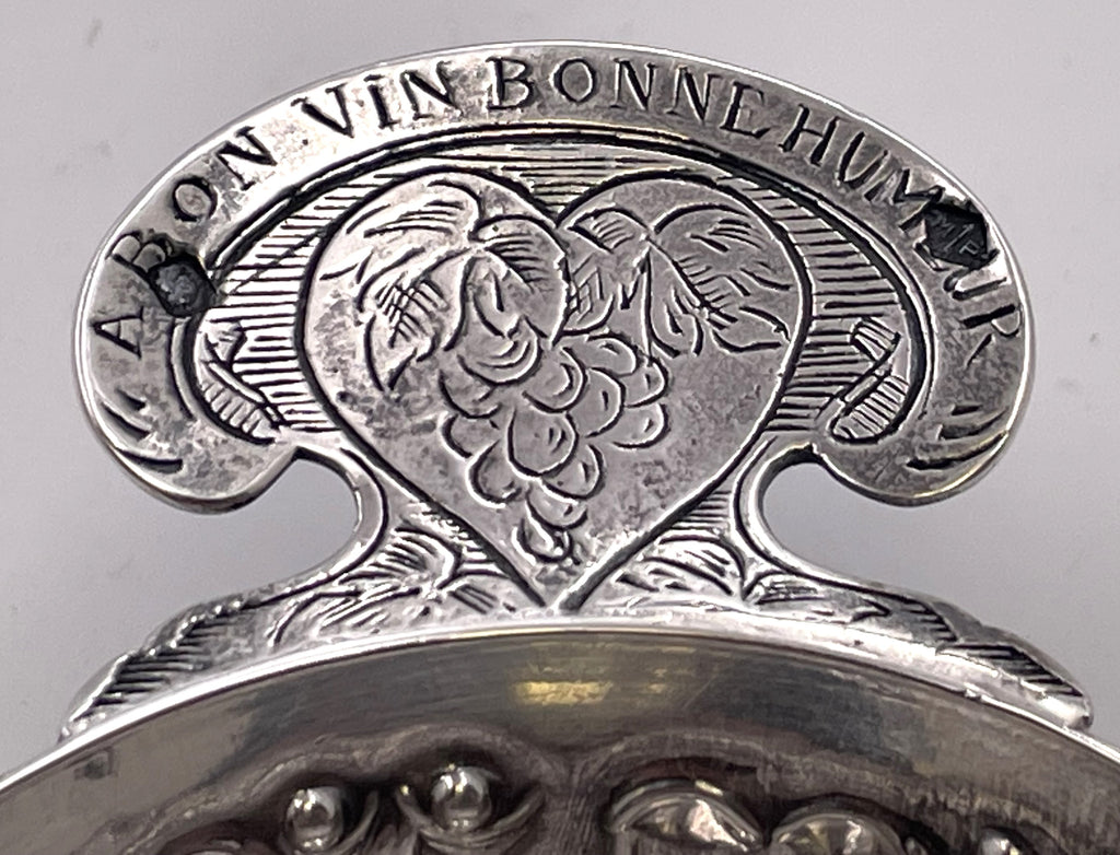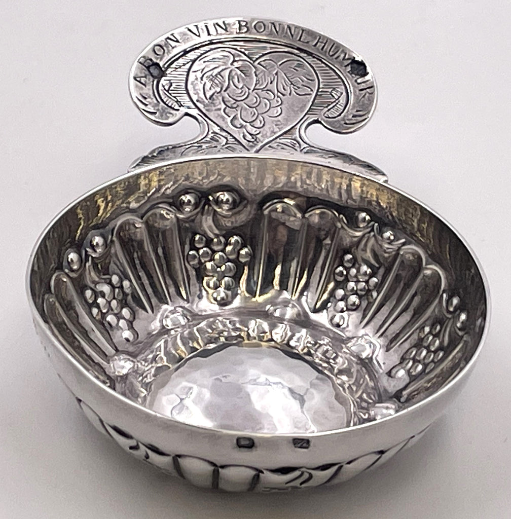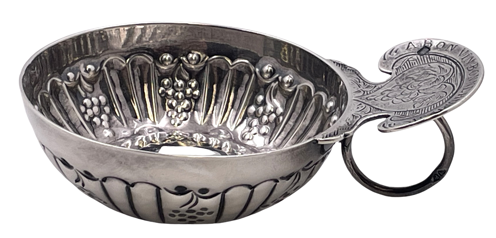 19th century French 0.950 (higher purity than sterling) tastevin (or wine taster). The inscription A Bon Vin Bonne Humeur translates as To Good Wine, Good Humor. The handle is beautifully engraved and there are raised grape motifs in the body. It measures 3 1/2'' in depth by 2 1/2'' in width by 1 1/4'' in height, weighs 1.6 troy ounces, and bears hallmarks as shown.