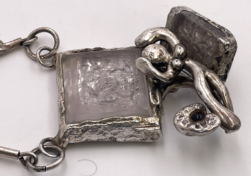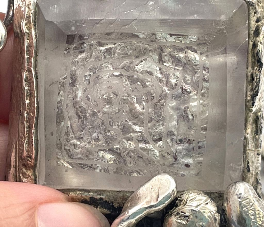 Jacob Hull silver necklace, the pendant made of engraved glass and silver. The pendant measures 2 1/2'' by 2 1/3'' while the overall length is 15 1/2''. The necklace is signed in the back.