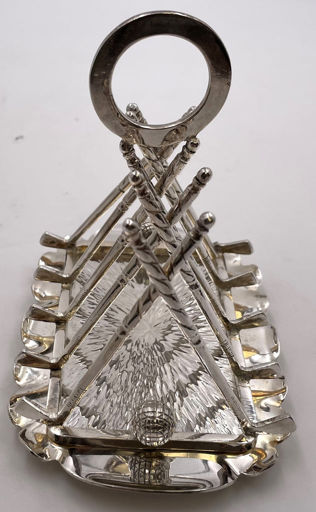 Fine silverplate toast rack, with rare golf theme, the holders shaped as clubs, and showcasing golf ball motifs on either end. This novelty toast rack measures 4 1/3'' in height by 5 1/2'' in depth by 3 2/3'' in width and is in new condition.