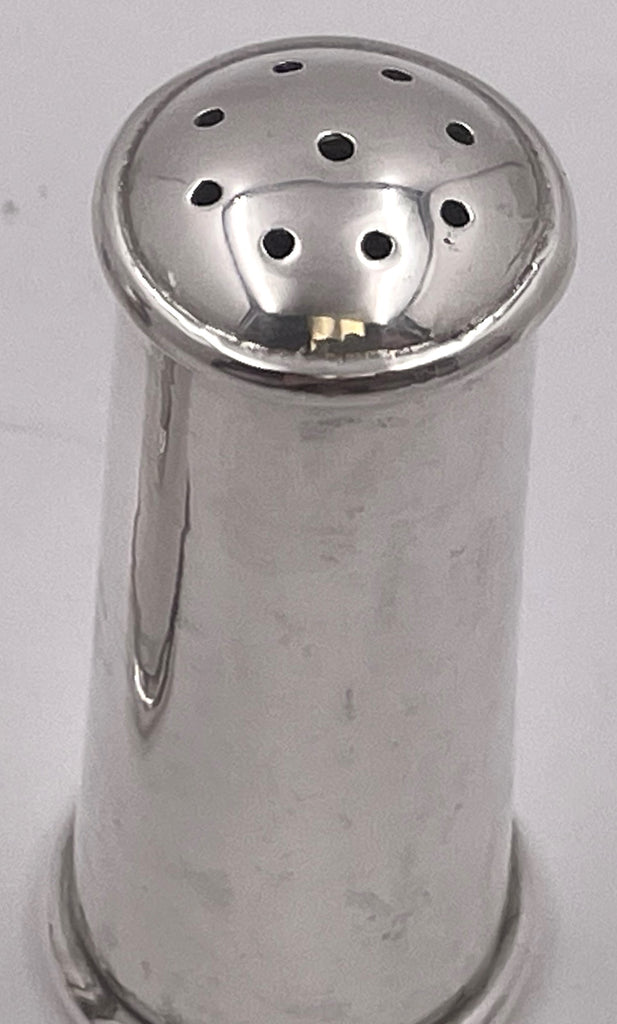 William Seitz pair of sterling silver, handwrought salt and pepper shakers in Arts & Crafts style, from the early 20th century. They measure between 3'' and 3 7/8'' in height by 1 1/3'' in diameter at the base, weigh 6 troy ounces, and bear hallmarks as shown.