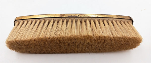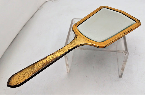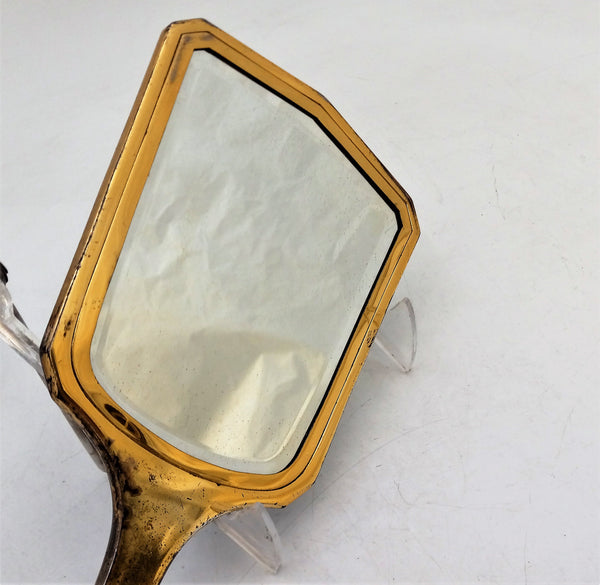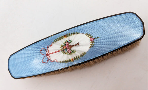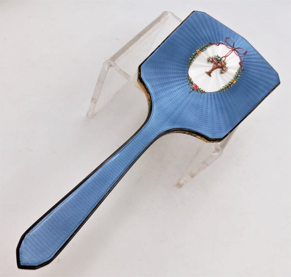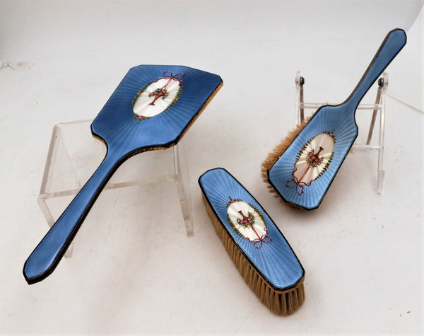 3-piece brush and mirror set with hand-wrought silver handles and enamel inlay, circa 1910. The mirror is 12" long and 4 1/2" wide; Hair brush is 9 1/4" long and 2 3/4" wide; Scrub brush is 6 1/2" long and 1 3/4" wide. Beautiful enamel inlay is in great condition.