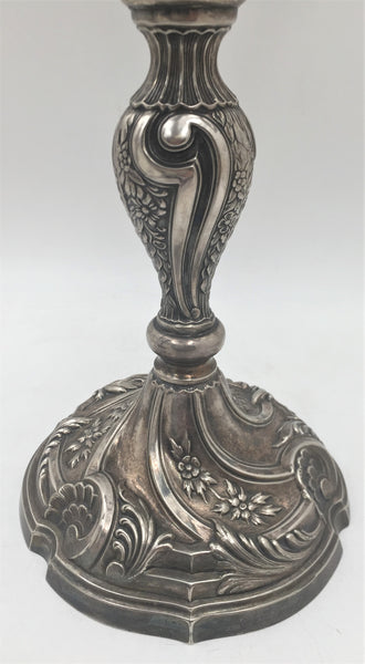 Massive and stunning pair of 5-light silver plate Rococo style candelabra from the late 19th century. Each measures 18 inches high and 14 inches wide, from arm to arm and bears hallmarks as shown.