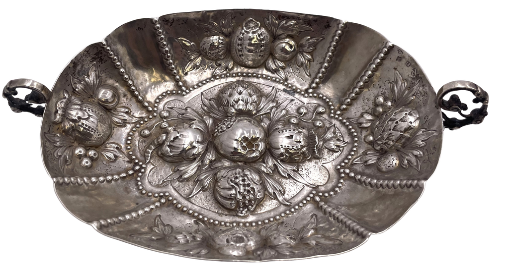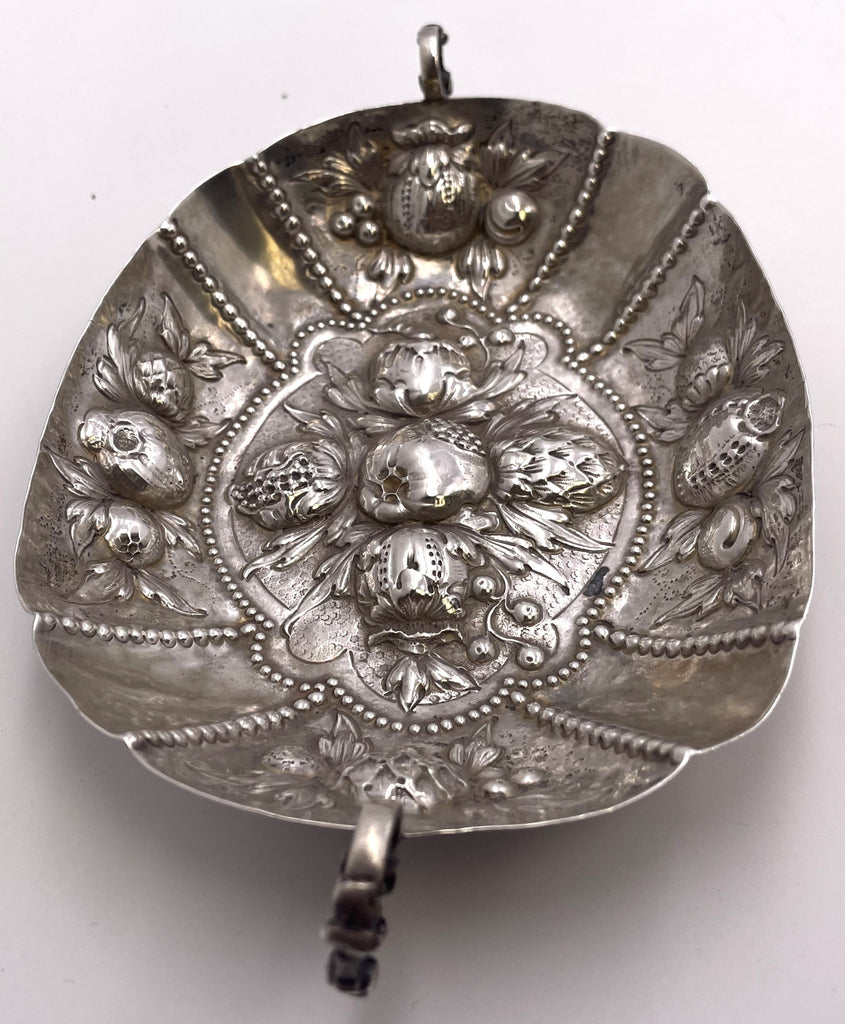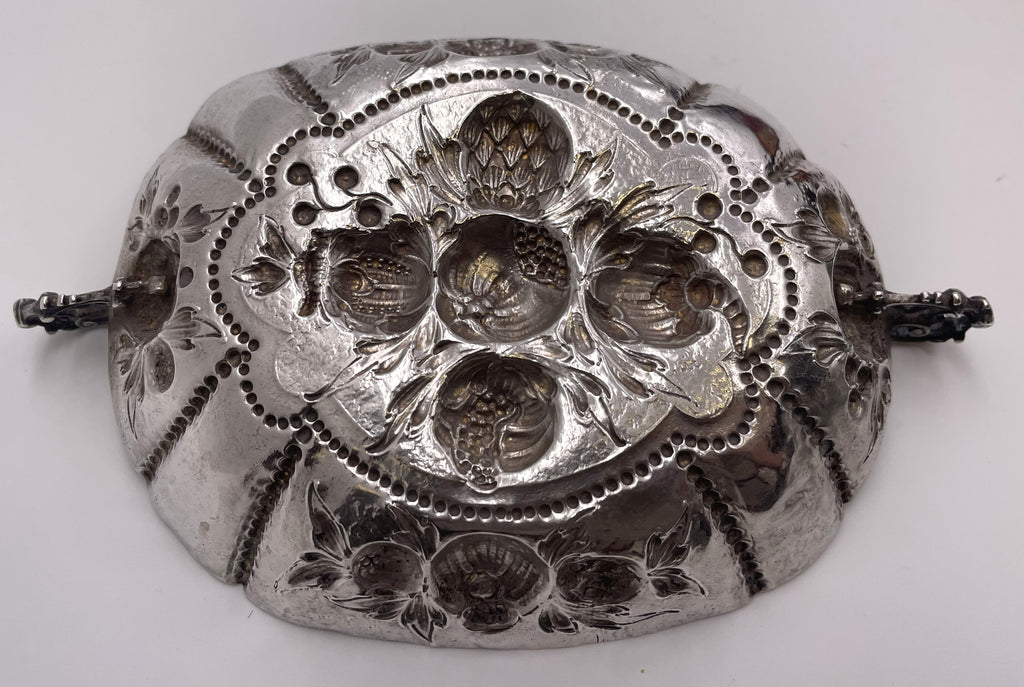 19th century, continental silver sweet meat dish in Augsburg/ Nuremberg style, with beautiful beaded and natural motifs. It measures 7 1/2'' from handle to handle by 5'' in width by 1 2/3'' in height and weighs 3.6 troy ounces.