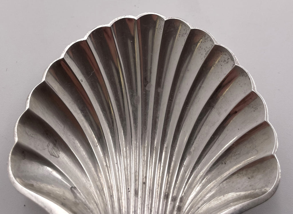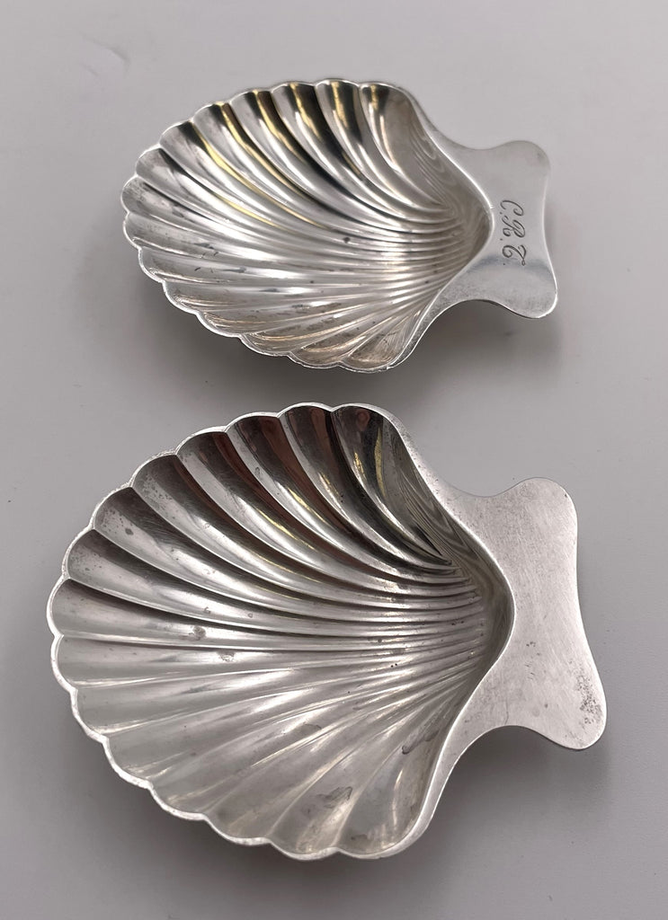Tiffany & Co. set of 3 sterling silver dishes shaped as a shell, two in pattern number 22479 and one in pattern number 22479L from the 20th century. They measure 2 3/4'' by 2 1/2'' by 1/2'' in height, weigh 3.3 troy ounces, and bear hallmarks as shown.