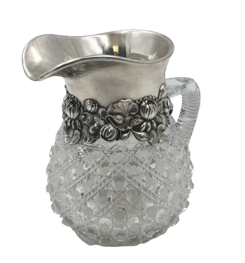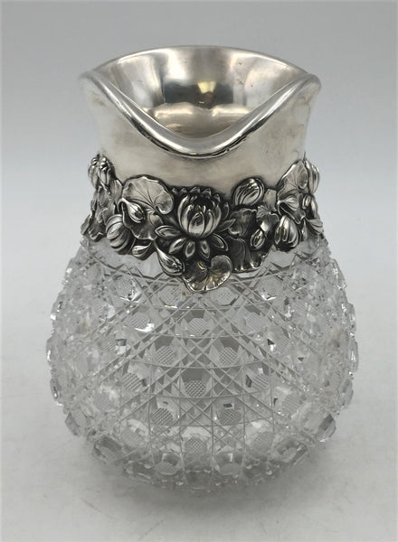 Early 20th century, Gorham sterling silver and cut glass pitcher or vase in Art Nouveau style with applied, dimensional peonies and stylized leaves around the body. It measures 8'' in height by 8 1/4'' from handle to spout approximately by 6 1/2'' in depth, weighs 61.4 ozt, and bears hallmarks as shown. There is a crack at the handle.