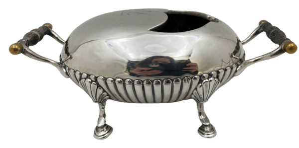 Charles Stuart Harris, English, sterling silver 1888, two-handled rare spoon warmer with an elegant design standing on 4 legs with fluted motifs at the bottom and an engraved eagle near the opening. It measures 8 1/2’’ from handle to handle (6 1/4’’ in length without) by 3 1/4’’ in height by 4’’ in depth, weighs 10.8 troy ounces, and bears hallmarks as shown.