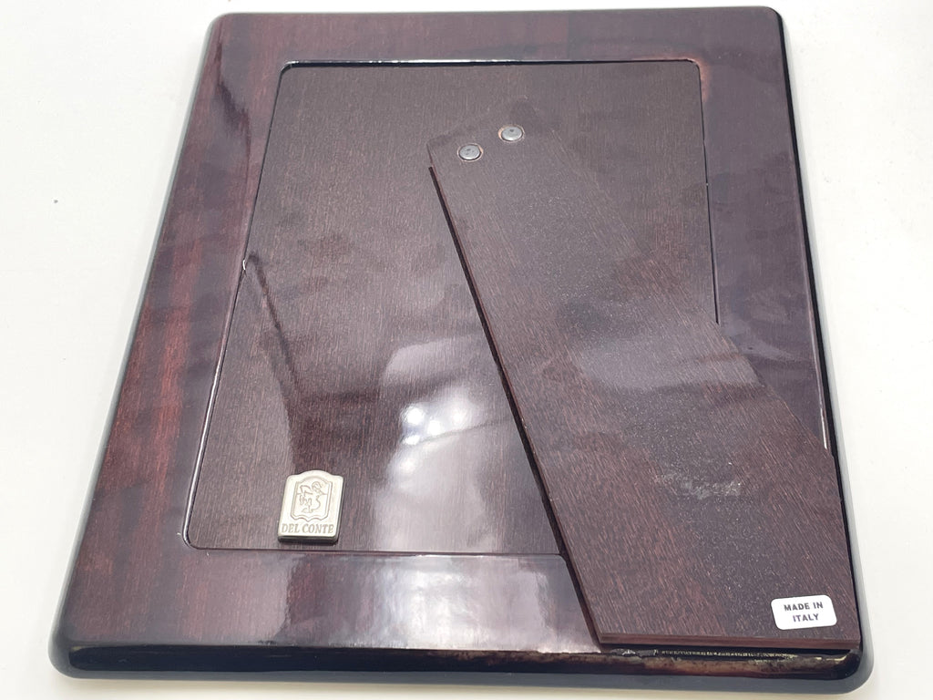 Del Conte, sterling silver picture frame, made in Italy, in sleek and elegant Mid-Century Modern design, with floral motifs on the corners. The outer dimensions are 10'' by 8''. The inner dimensions are 7'' by 5''. The frame is in excellent, new condition and is backed with a wood back. Hallmarks are shown.