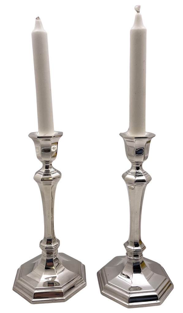 Pair of Tiffany & Co. sterling silver candlesticks in Mid-Century Modern style, with an elegant, geometric design, standing on a stepped octagonal base. They measure 9 2/3'' in height by 4 1/2'' in diameter at the base, weigh 22.9 troy ounces, and bear hallmarks as shown.