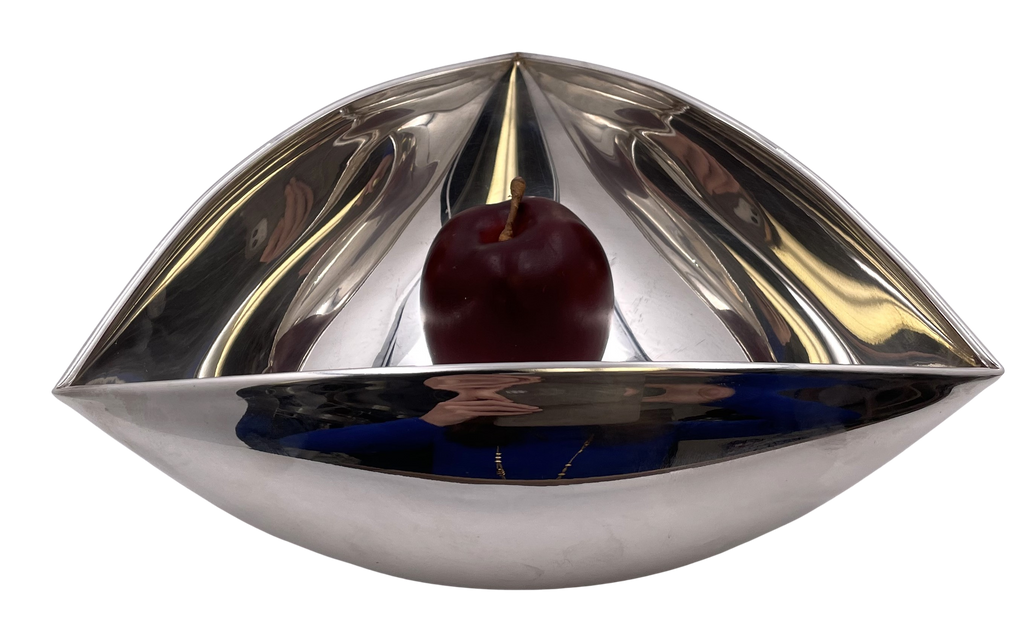 Pampaloni for Barney's silver plate centerpiece bowl in Mid-Century Modern style, with an elegant, geometric design. It measures 10 1/2'' by 8'' by 5'' in height and bears hallmarks and the original tag as shown.