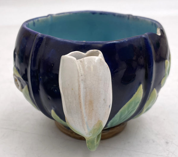 George Jones majolica cup and saucer from the Victorian era (1870s) with floral motifs on a cobalt background. The set measures 3'' in height by 6'' in diameter (diameter of the teacup is 3'') and bears marks as shown.