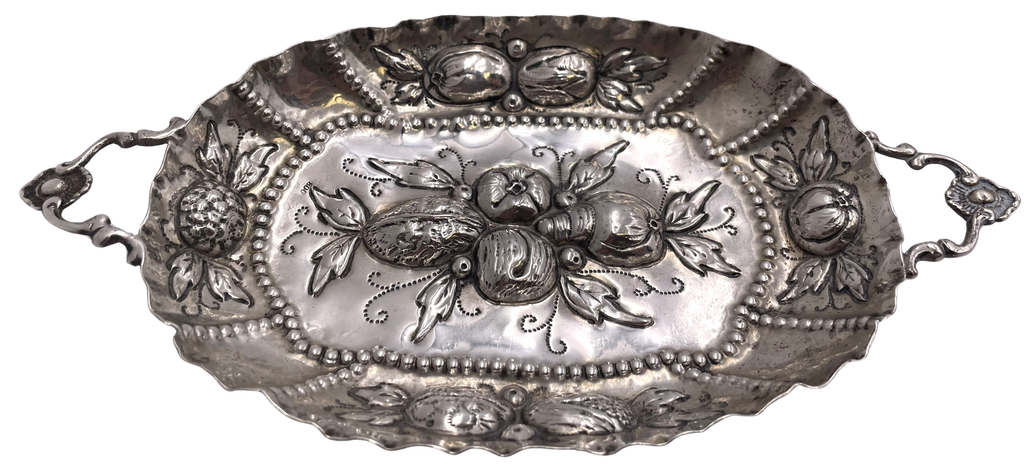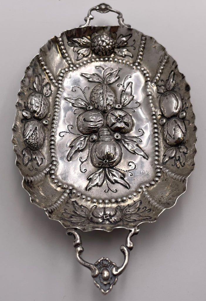 19th century, continental silver sweet meat dish in Augsburg/ Nuremberg style, with beautiful beaded and natural motifs. It measures 7 3/4'' from handle to handle by 4'' in width by 3/4'' in height and weighs 2.2 troy ounces.