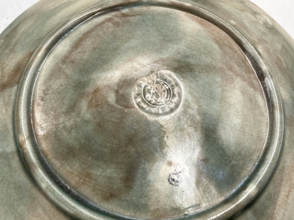 Etruscan majolica leaf plate or dish, presumably from the late 19th century. It measures 9 1/4'' in diameter and bears marks as shown.