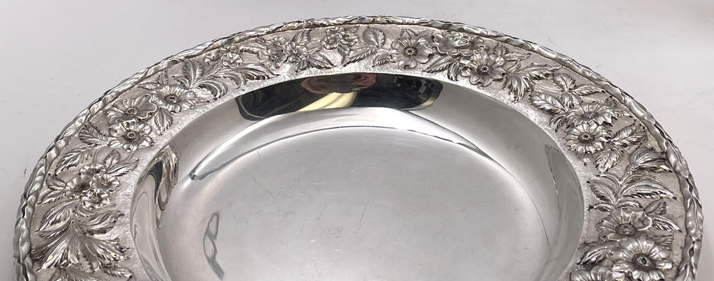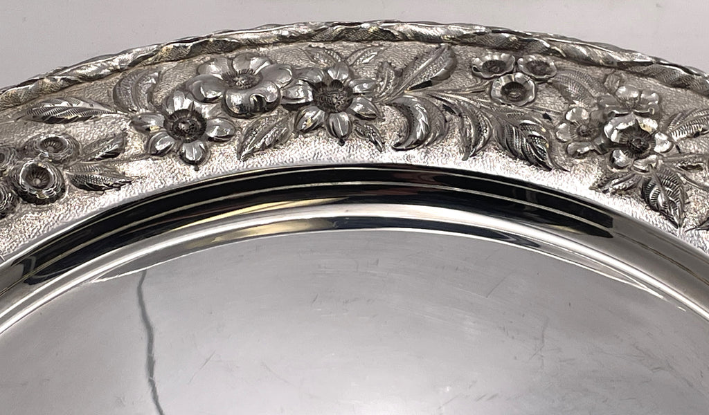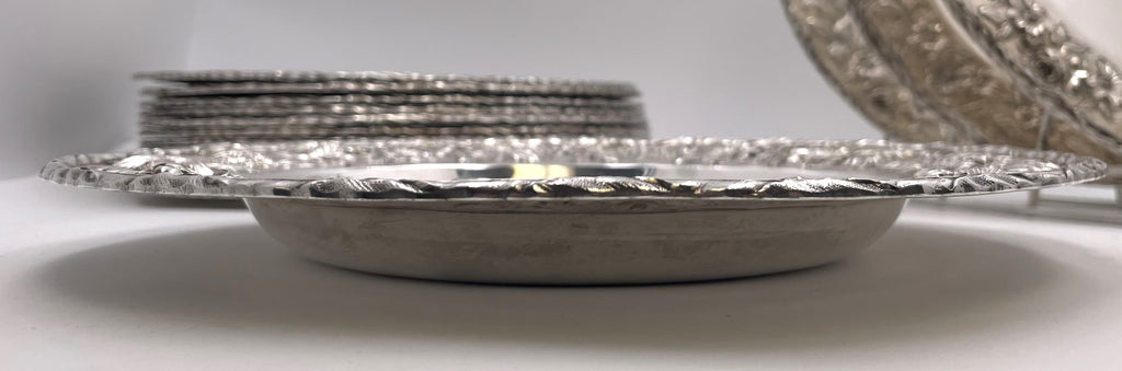 S. Kirk & Son set of 18 sterling silver plates, hand-decorated in exquisite repousse pattern, beautifully adorned with floral motifs along the rim, from the early 20th century, consisting of: