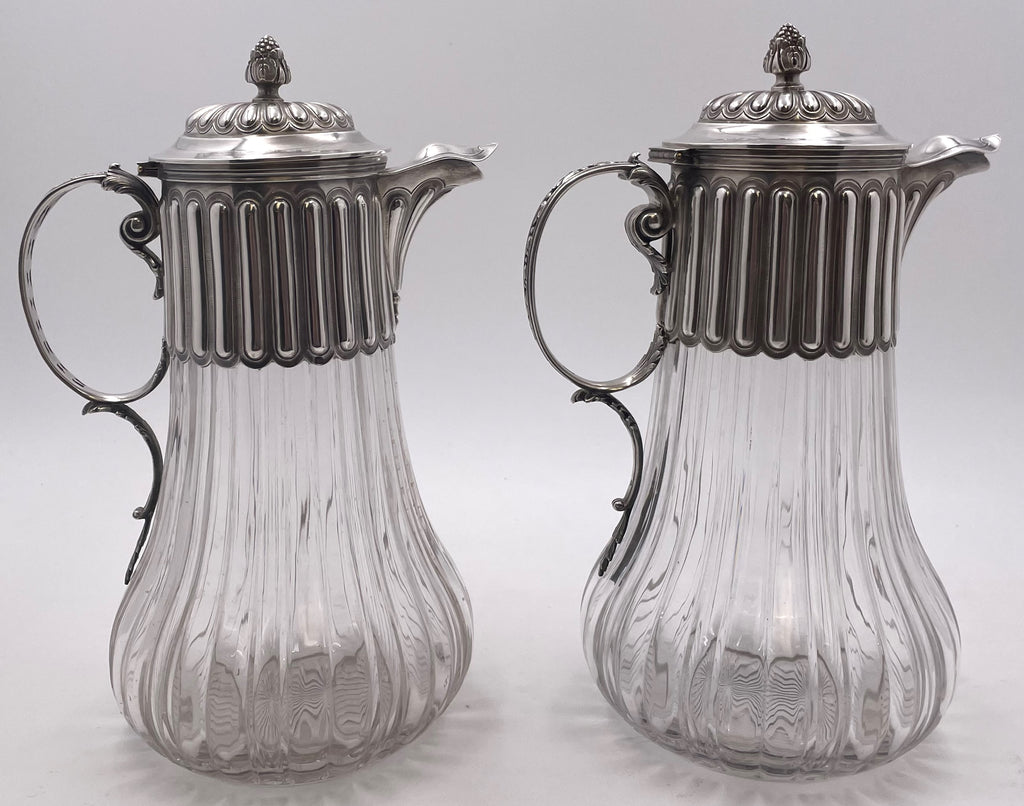 Pair of French Sterling Silver and Cut Glass Carafes/ Pitchers from Late 19th Century