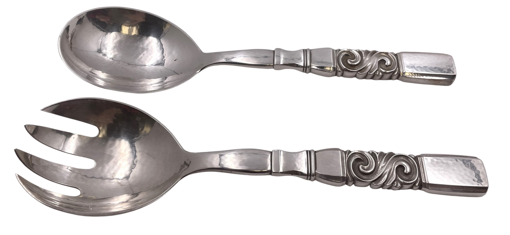 Georg Jensen sterling silver 2-piece salad set (fork and spoon), beautifully hand-hammered, in the celebrated Scroll pattern, with an elegant, geometric design. They measure 8 1/2'' in length, weigh 6 troy ounces, and bear hallmarks as shown.
