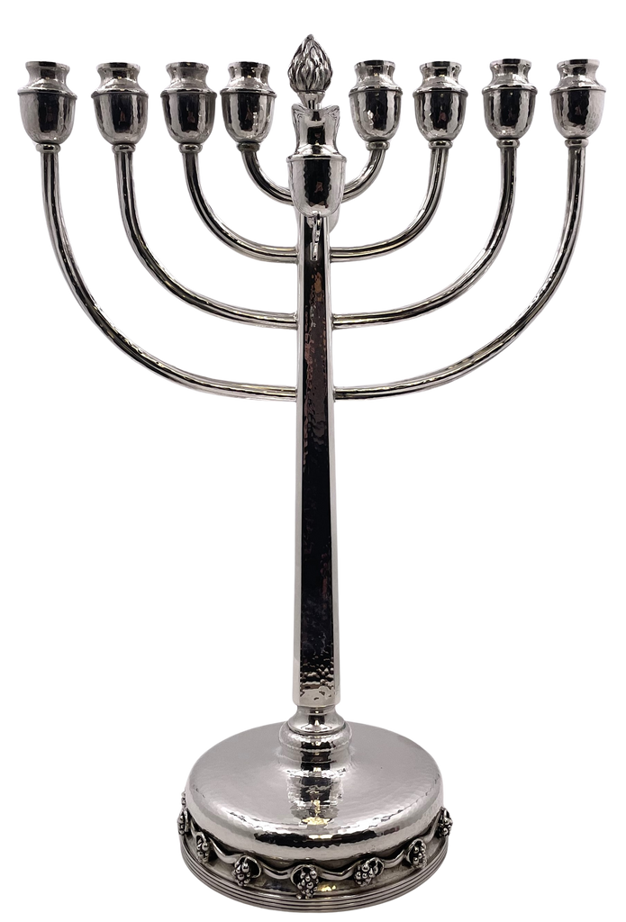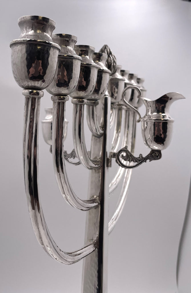 In the style of Georg Jensen, by Michael Strauss, handmade and unique sterling silver menorah, beautifully hand-hammered, with grape motifs adorning the base. It measures 20'' in height by 14'' in width, weighs 59 troy ounces, and bears hallmarks as shown.