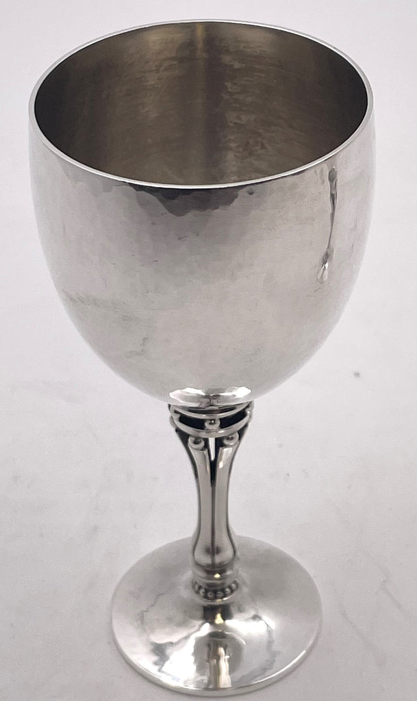 Pair of Georg Jensen sterling silver goblets or Kiddush cups, in pattern number 532A, designed by Harald Nielsen, beautifully hand-hammered, with an elegant, geometric design. They measure 5 1/4'' in height by 2 1/3'' in diameter at the top, weigh 8.5 troy ounces, and bear hallmarks as shown.