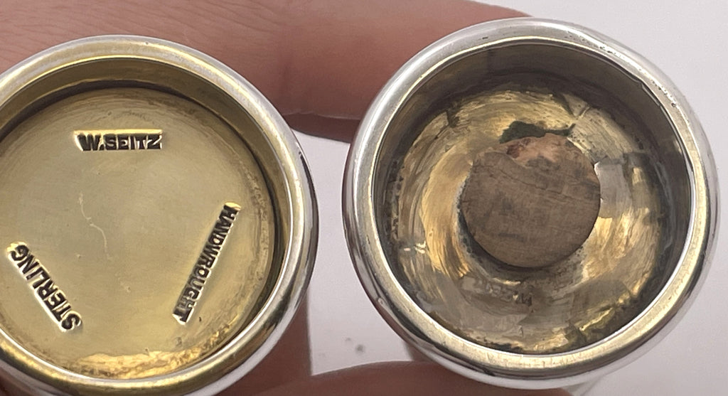 William Seitz pair of sterling silver, handwrought salt and pepper shakers in Arts & Crafts style, from the early 20th century. They measure between 3'' and 3 7/8'' in height by 1 1/3'' in diameter at the base, weigh 6 troy ounces, and bear hallmarks as shown.