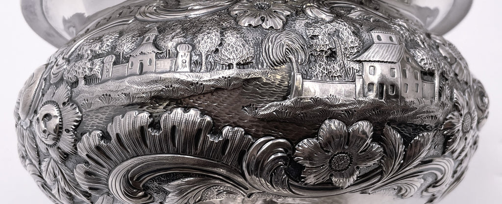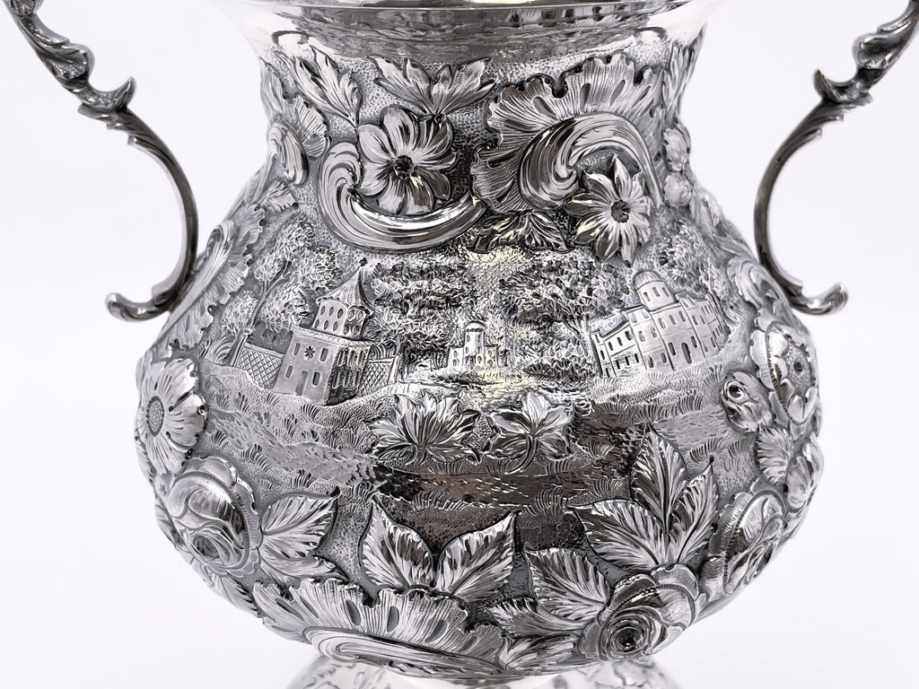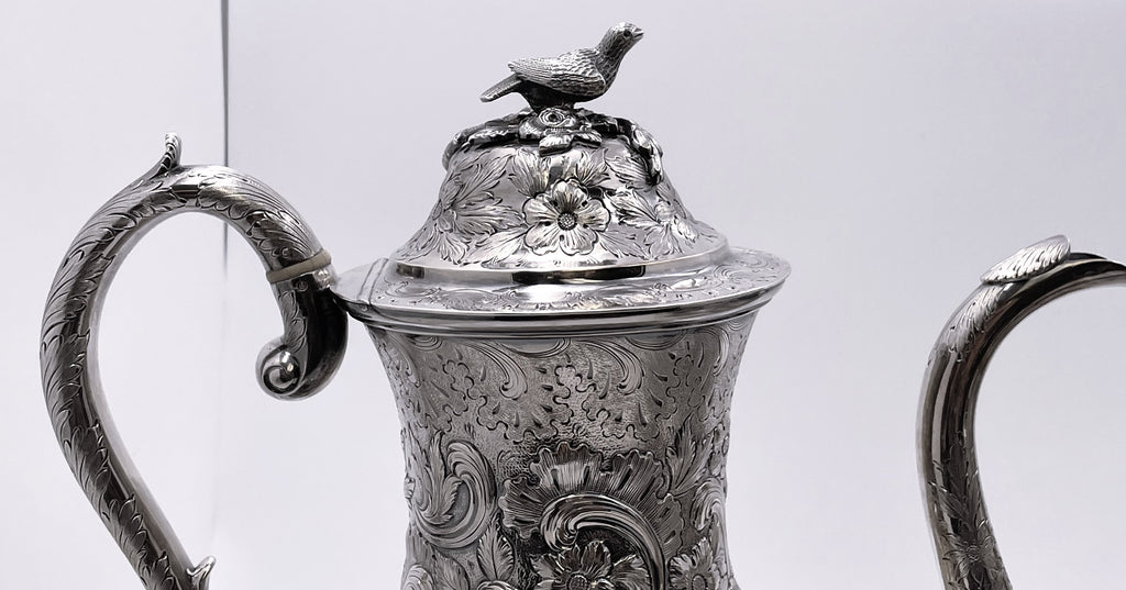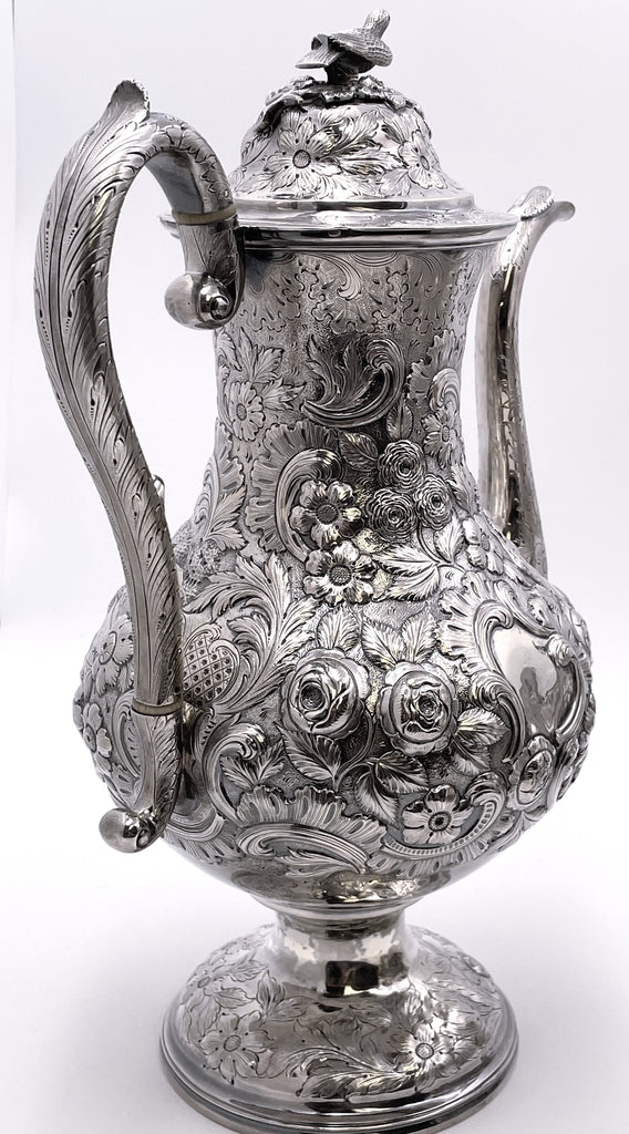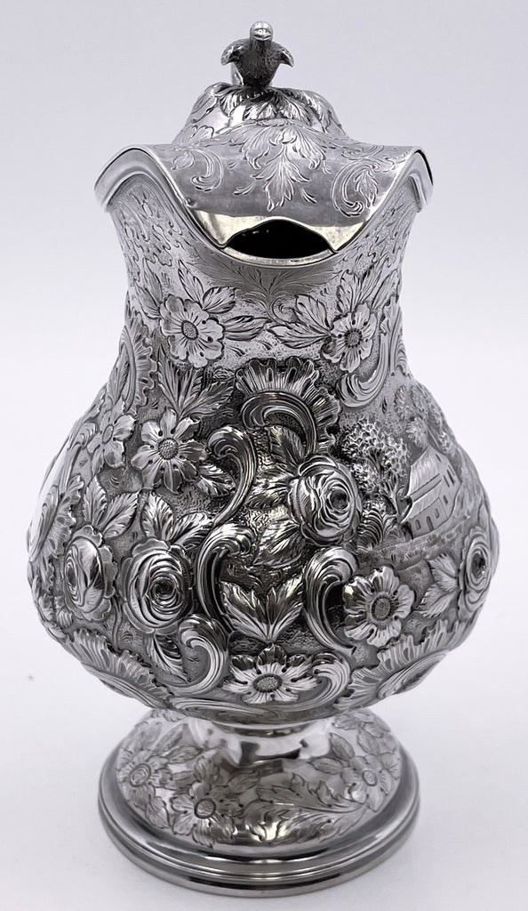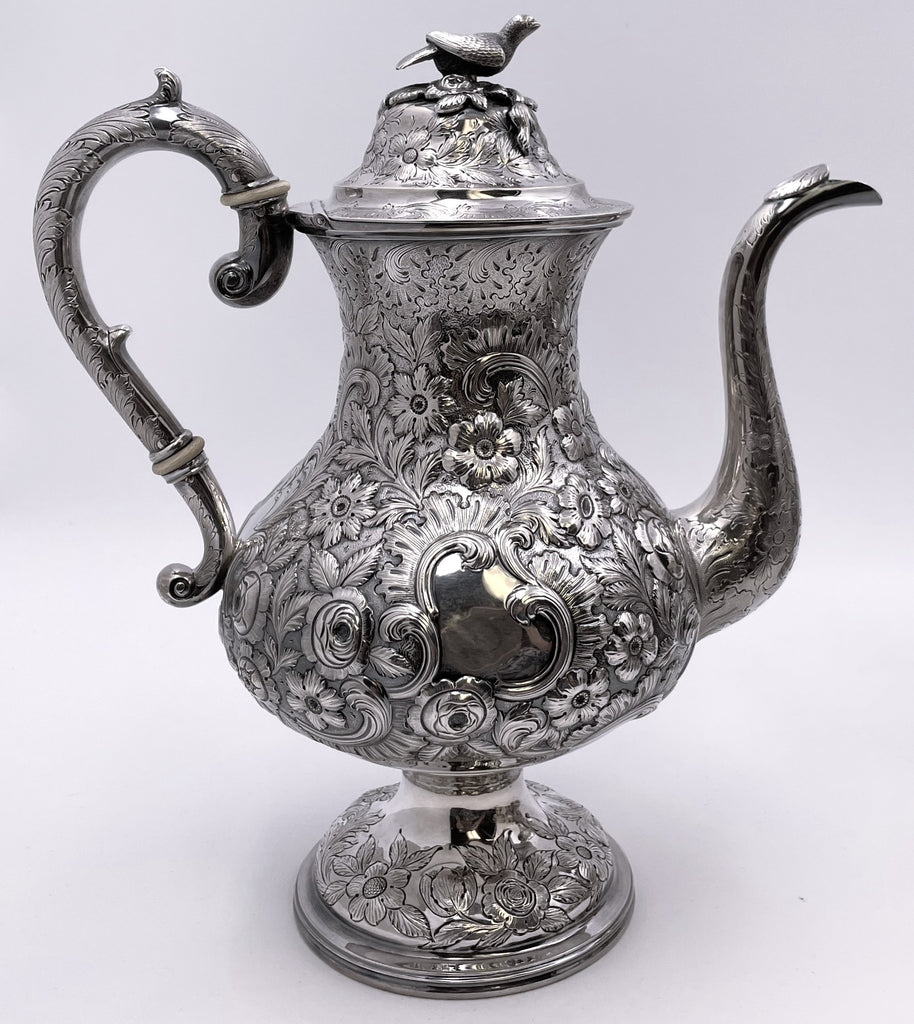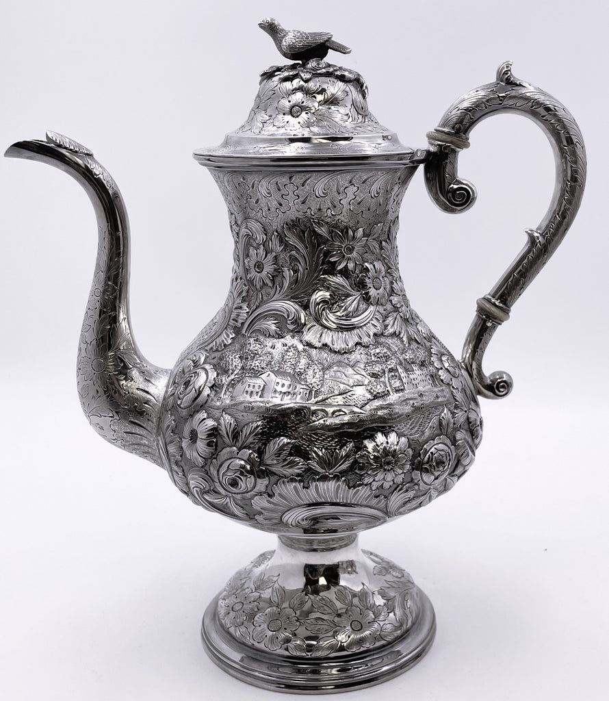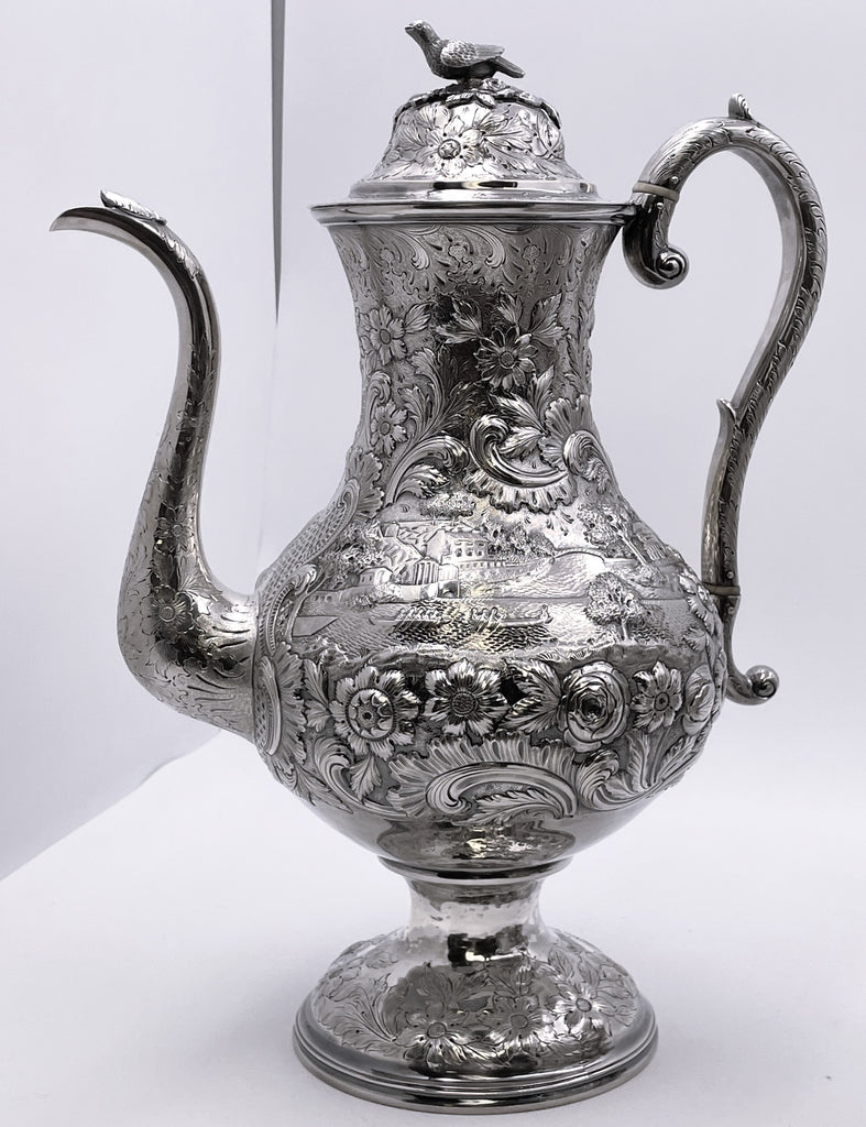 Exceptional Robert and William Wilson coin silver 6-piece tea and coffee set in architectural Castle chinoiserie repousse pattern, with bird finials, all hand-chased, with great details on the raised motifs, from the mid-19th century, consisting of: