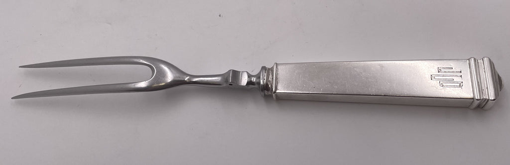 Tiffany & Co. sterling silver 2-piece carving set in the celebrated Hampton pattern and in Art Deco style, with an elegant, geometric design. The carving fork measures 11 1/4'' in length while the carving knife measures 13 7/8'' in length. Hallmarks and a monogram are shown.