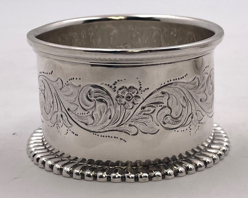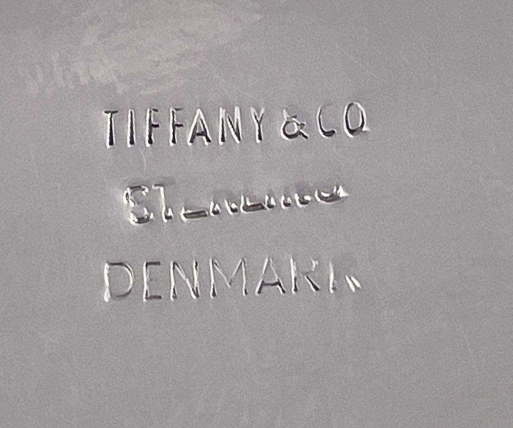 Pair of Tiffany & Co. sterling silver cachepots, made in Denmark, with a gadrooned rim, and with exquisite floral and other stylized natural motifs. They measure 2 7/8'' in diameter at the base by 1 1/2'' in height, weigh 6.6 troy ounces, and bear hallmarks as shown.