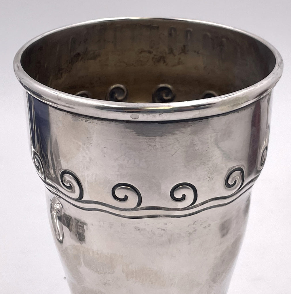 Danish silver vase, beautifully hand-hammered, with an elegant, geometric design, the body and based adorned with stylized geometric motifs. It measures 7'' in height by 4 1/4'' in diameter at the top, weighs 8.5 troy ounces, and bears hallmarks as shown.